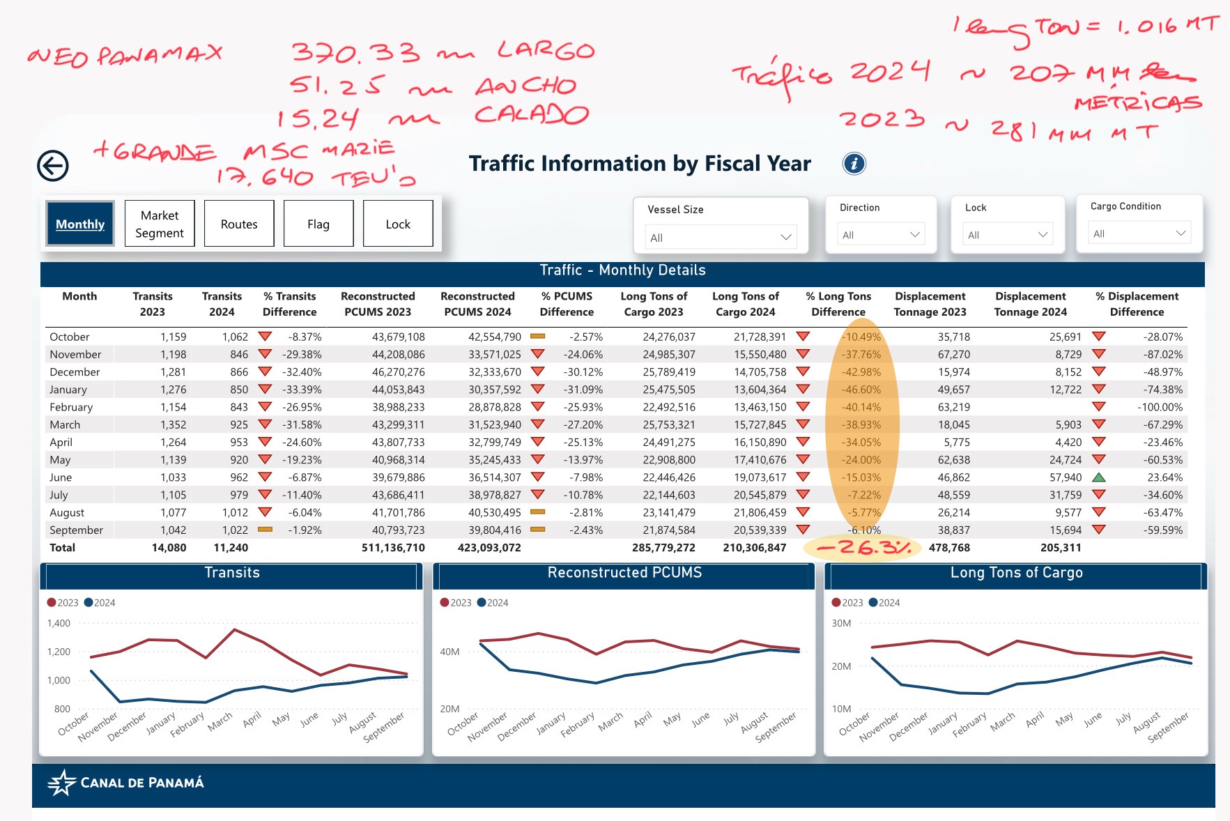 2. El año fiscal 2023 (octubre 2022 a septiembre 2023) se movieron a través del Canal de Panamá 281 millones de toneladas métricas (TM); el año fiscal 2024 éstas cayeron en 26% a 207 millones de TM.