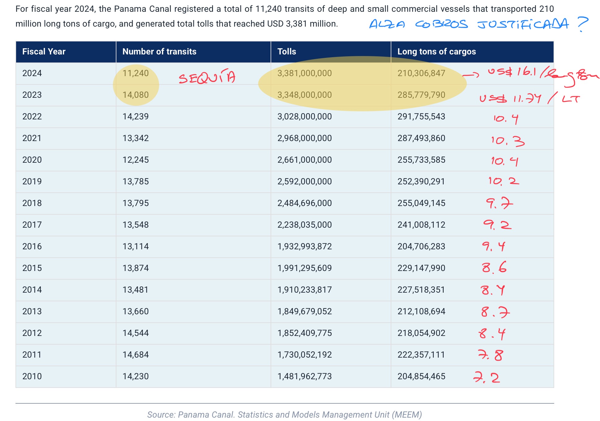 5. De 14.080 barcos que transitaron en el año fiscal 2023 se pasó a 11.240 en los siguientes 12 meses, influido por las condiciones restrictivas de la sequía, ya superada en los últimos meses del año calendario 2024. Sin embargo, los cobros recibidos por el canal fueron en ambos años por US$ 3.3 billones. ¿Justifican los mayores costos de operación esas alzas? Hay que considerar aquí que por la sequía los barcos de mayor tonelaje, más “baratos” por tonelada, bajaron su participación en el total movido a través del canal, lo que naturalmente crea un sesgo al alza en la tarifa media de US$ por tonelada de todo el volumen transitado.