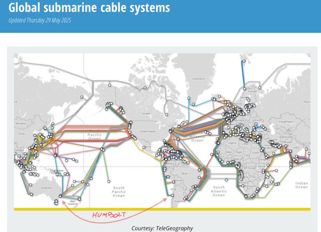 La red mundial de cables submarinos para las comunicaciones se despliega horizontalmente en el hemisferio norte y desde ahí se originan verticalmente conexiones hacia el sur. El gran cambio en curso es que próximamente se estará instalando el cable de fibra óptima Humbolt, liderado por Google, conectando directamente Santo Domingo – Santiago con Sidney, Australia por el Pacífico Sur, que se suma al cable Curie, también de Google, que conecta directamente Valparaíso – Santiago con Los Ángeles, California, y a aquel otro reciente Mistral de América Móvil que conecta Valparaíso – Santiago con Centroamérica, por mencionar a los más importantes que permiten transformar a Chile eventualmente en un hub digital de América del Sur. Incluso el día de mañana podría haber una conexión directa por el Pacífico con China desde Valparaíso, pero ello requeriría como condición básica no poner en riesgo esta red estructural liderada por Google y las decisiones de inversión estratégicas de sus grandes operadores occidentales.