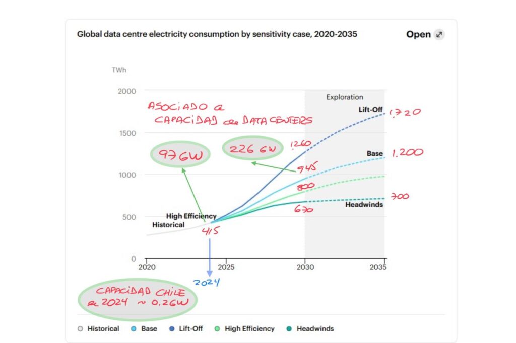 No hay inteligencia artificial sin energía: el año 2024 los data centers consumieron globalmente 415 TWh de electricidad – Chile en su totalidad consumió 79.5 TWh en igual período -. Al año 2030 el escenario base de la Agencia de Energía Internacional (IEA) proyecta un consumo de 945 TWh, más del doble del anterior y que vistas las inversiones en curso, probablemente se quede corto … La capacidad instalada mundial de data centers al año 2024 era de 97 GW – la chilena, irrelevante, era de aproximadamente 200 MW o 0.2 GW -; para el año 2030 sería de 226 GW – la chilena, otro milagro de desarrollo es el que debería hacerse realidad -.