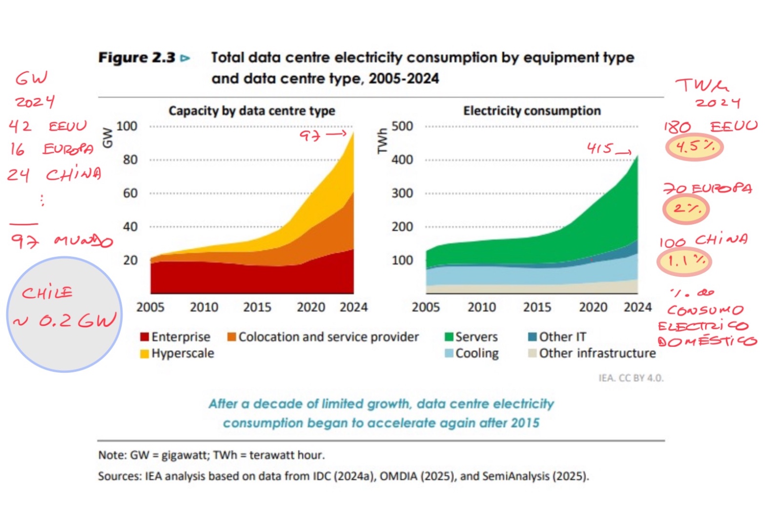 No hay inteligencia artificial sin energía: el año 2024 los data centers consumieron globalmente 415 TWh de electricidad – Chile en su totalidad consumió 79.5 TWh en igual período -. Al año 2030 el escenario base de la Agencia de Energía Internacional (IEA) proyecta un consumo de 945 TWh, más del doble del anterior y que vistas las inversiones en curso, probablemente se quede corto … La capacidad instalada mundial de data centers al año 2024 era de 97 GW – la chilena, irrelevante, era de aproximadamente 200 MW o 0.2 GW -; para el año 2030 sería de 226 GW – la chilena, otro milagro de desarrollo es el que debería hacerse realidad -.