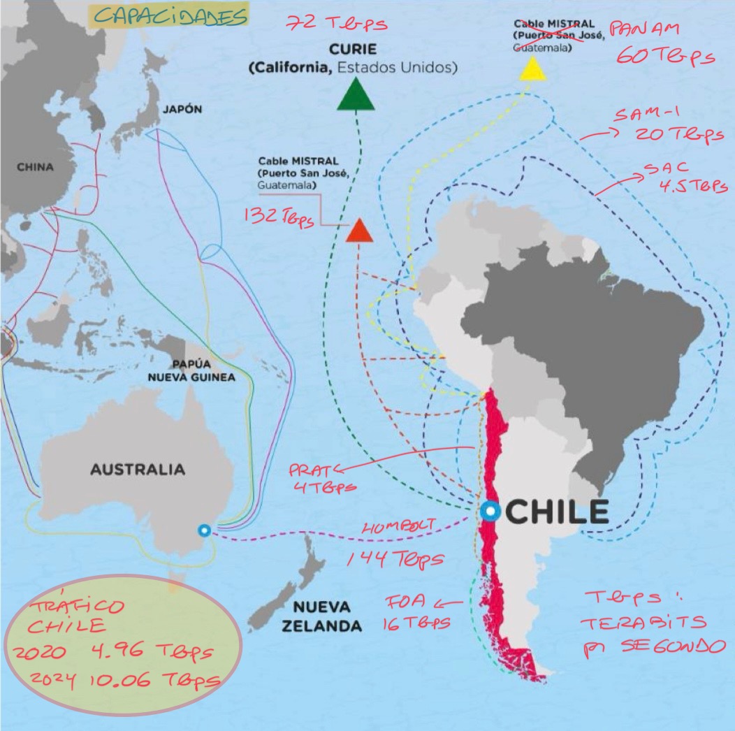 La red mundial de cables submarinos para las comunicaciones se despliega horizontalmente en el hemisferio norte y desde ahí se originan verticalmente conexiones hacia el sur. El gran cambio en curso es que próximamente se estará instalando el cable de fibra óptima Humbolt, liderado por Google, conectando directamente Santo Domingo – Santiago con Sidney, Australia por el Pacífico Sur, que se suma al cable Curie, también de Google, que conecta directamente Valparaíso – Santiago con Los Ángeles, California, y a aquel otro reciente Mistral de América Móvil que conecta Valparaíso – Santiago con Centroamérica, por mencionar a los más importantes que permiten transformar a Chile eventualmente en un hub digital de América del Sur. Incluso el día de mañana podría haber una conexión directa por el Pacífico con China desde Valparaíso, pero ello requeriría como condición básica no poner en riesgo esta red estructural liderada por Google y las decisiones de inversión estratégicas de sus grandes operadores occidentales.