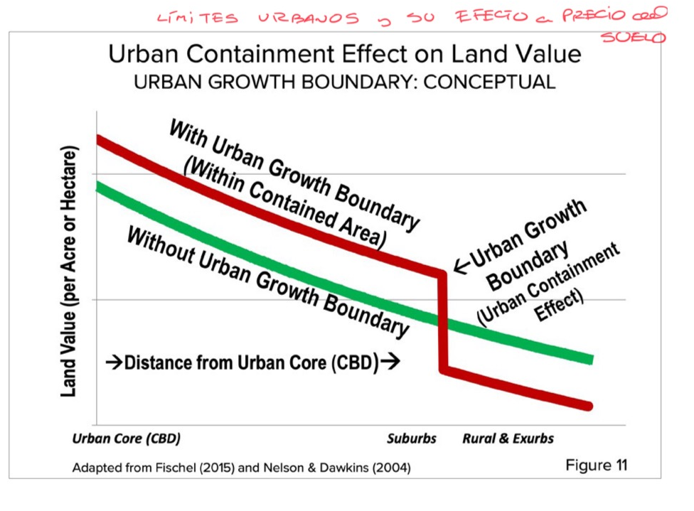En la práctica, la gradiente descendente de precios del suelo desde el centro operativo de la ciudad (Central Business District, o CBD) a medida que se va hacia la periferia se intervino de manera discrecional generando un alza relativa del precio de éste al interior del límite urbano respecto de aquel fuera de este verdadero Muro de Berlín: