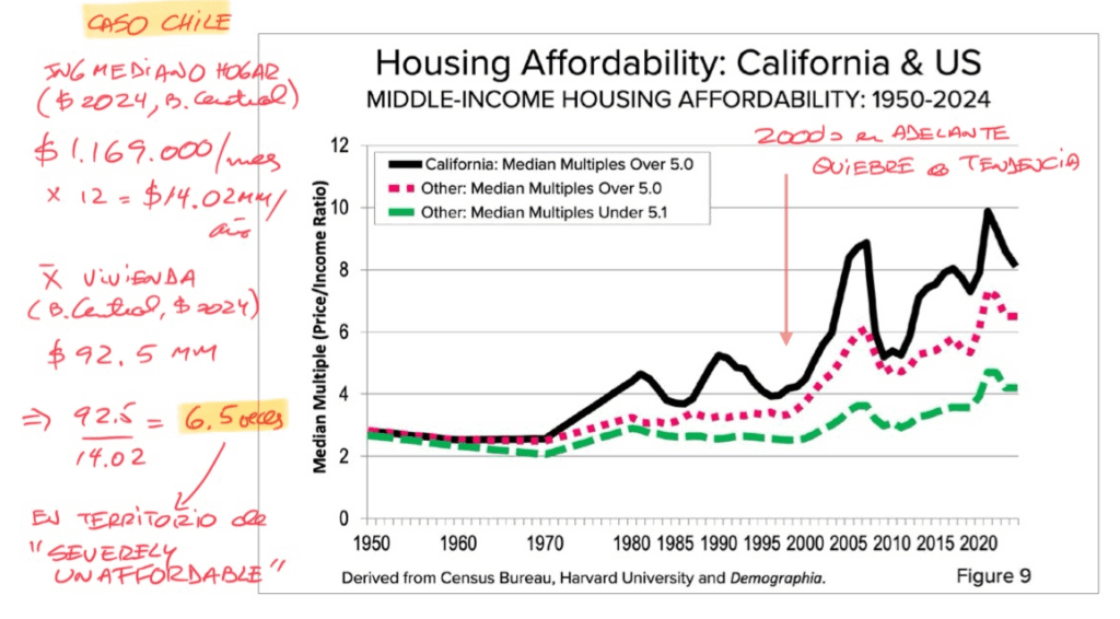 ¿Se habrá dado cuenta la autoridad del desastre que ha estado generando? En el caso de Chile, tomando como referencia el ingreso mediano de los hogares del año 2024 y el precio promedio de la vivienda (como aproximación a la mediana, cuya estimación no se dispone), se está en el territorio en que la vivienda sería calificada como “severamente inalcanzable” o “severely unaffordable”, con un valor de affordability (mientras mayor es su número, peor es la accesibilidad a la vivienda) superior a las 6 veces.