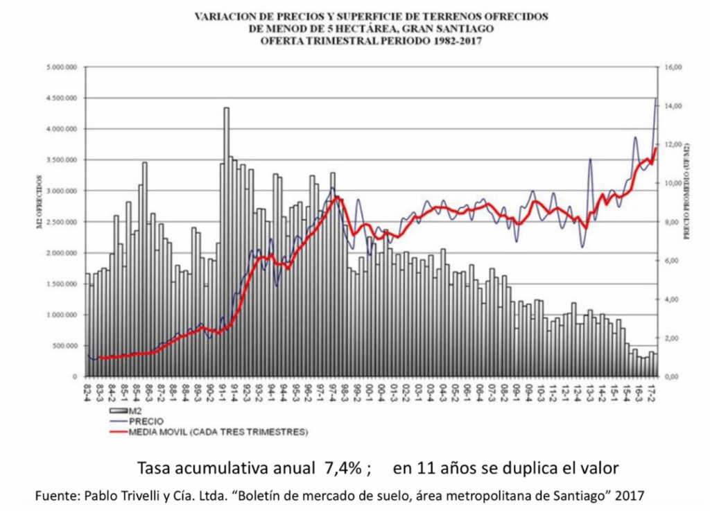La magia de los precios del suelo, capturada por Trivelli, o la contracara de la menor accesibilidad a la vivienda: notar cómo a comienzos de los 90´s el salto en los precios del suelo en el Gran Santiago es notorio, y si bien la caída en la tasa de interés real de largo plazo explica parcialmente este incremento (en el extremo, 500 puntos básicos de caída en la tasa de descuento de largo plazo desde 8% real a 3% real en una perpetuidad incrementan en 2.6 veces su valor presente), entre comienzos de los 90´s y el año 2017, previo a la pandemia, los precios del suelo se incrementaron en más de 6 veces. En otras palabras, más de la mitad de la explicación del fuerte salto en el valor del suelo vendría dada por este racionamiento arbitrario del área urbana.