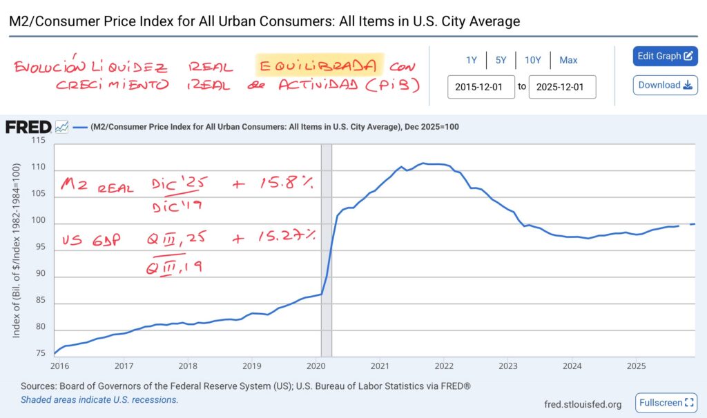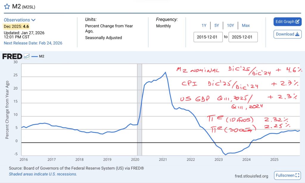 En términos nominales, el M2 creció un 4.6% en diciembre 2025 en relación a diciembre 2024 y el CPI (Consumer Price Index), un 2.7% en igual período – y 2.4% entre enero 2026 y enero 2025, como hoy se anunció -, con un PIB que en el tercer trimestre de 2025 creció un 2.3% en relación al tercer trimestre de 2024. Agregados equilibrados.