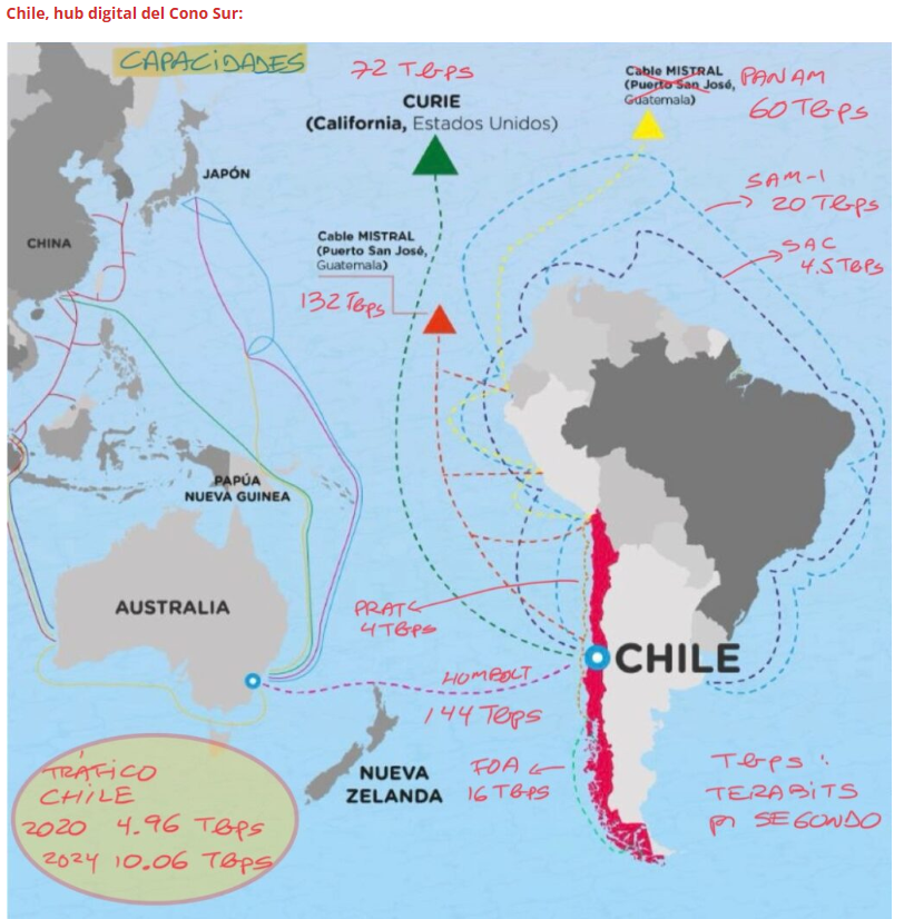 En el mundo actual, la infraestructura digital pasó a ser estratégica y Chile, especialmente a raíz de desarrollos impulsados por Google – el cable Curie que ya conecta directamente Valparaíso con Los Ángeles, California – y Humbolt – el cable aprobado pero todavía no instalado que conectaría Valparaíso con Sidney, Australia -, complementado con el cable Mistral de América Móvil que conecta directamente Valparaíso con Centroamérica y el cable PanAm que rodea América del Sur, se ha transformado en un privilegiado hub digital en el Cono Sur.