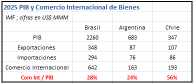 Chile destaca hoy por su mayor apertura, pero al menos la Argentina actual va camino a lo mismo. Distinto sería el panorama regional si el comercio internacional de bienes anual de Brasil fuese de US$ 1.300 billones y el de Argentina de US$ 380 billones, asimilando su grado de apertura al chileno. De todas maneras se abrirían inmensas oportunidades para Chile, tanto en los bienes y servicios per sé como en el uso de su infraestructura vial, portuaria y eléctrica, además de gasoductos y oleoductos. Unos, Atlánticos, que cuentan con desarrollos productivos de petróleo y gas natural nunca antes vistos en estas latitudes, así como son protagonistas de un corazón agrícola alimenticio a nivel mundial; el otro, que mira al Pacífico, con un potencial solar excedentario, central en el cobre y litio mundiales y con cables submarinos de comunicaciones que le permiten ser parte activa del desarrollo de data centers y soporte de la inteligencia artificial del orbe. Un núcleo envidiable de gente y recursos naturales en la medida que se le deje aprovechar sus talentos…