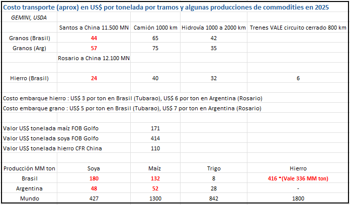 El famoso corredor vial bioceánico Capricornio, de 2.400 km de extensión, se encuentra avanzado y pavimentado en los tramos de Brasil y Chile, el puente sobre el río Paraguay está en construcción y se espera que las obras de pavimentación en el sector argentino se activen prontamente. Una obra de integración ciertamente necesaria, pero sería ingenuo esperar que por ahí circule una parte relevante de las 400 MM de toneladas del hierro brasilero hacia Chile con destino a China. En el caso de Vale, el principal actor del hierro brasilero, con su sistema integrado ferroviario, portuario y naviero, sus costos logísticos y capacidad de volumen por la salida Atlántica son imbatibles. Por el lado de la soya, una parte menor de las 110 MM de toneladas exportadas por Brasil – esencialmente a China – podría salir por el Pacífico. Pero ese no es el punto: su importancia radica en seguir facilitando el comercio e indirectamente integrar más sus economías aprovechando las ventajas logísticas en su mérito.