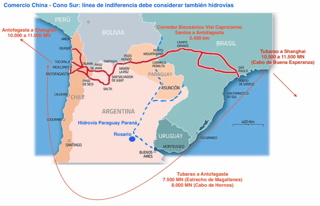 El gran importador de granos y hierro del Cono Sur es China: la vía de salida natural es Atlántica. Sólo en la parte central de éste y cuando no se tuviese acceso a la hidrovía del sistema de ríos Paraguay – Paraná o ésta estuviese restringida por baja profundidad de sus aguas, se podría pensar en la salida Pacífica. Las ventajas del transporte marítimo son enormes: los tramos terrestres de las cargas pueden llegar a ser prohibitivos en el mundo de los commodities, pero el caso es distinto en bienes de mayor valor donde el peso del costo logístico es significativamente menor. Es en este otro tipo de bienes que todavía no asoman por restricciones al comercio exterior autoimpuestas donde podría darse un cambio estructural mayor y que podrían representar un peso sustancial en los flujos de comercio del Cono Sur, entre sus miembros y hacia y desde el resto del mundo, si éstas se alzaran.