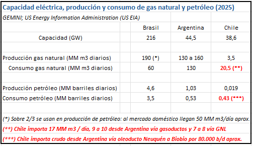 Donde existe una incipiente integración en el campo energético es entre Chile y Argentina, tanto por la importación de crudo desde Neuquén por unos 80.000 barriles diarios de petróleo que se refinan en la planta de ENAP en Hualpén, región de Biobio, que tiene una capacidad de procesamiento de 116.000 barriles diarios – Chile consume diariamente sobre 400.000 barriles de petróleo, en sus distintas formas – , así como por la importación de gas natural de 9 a 10 MM de m3 al día, que representan casi la mitad del consumo del país. La integración eléctrica existente vía Salta hoy no pesa en el sistema: se pueden exportar hasta 80 MW desde Chile e importar a éste hasta 200 MW de manera instantánea: en el año 2025 la demanda eléctrica máxima bruta en Chile sobrepasó los 13.000 MW…
