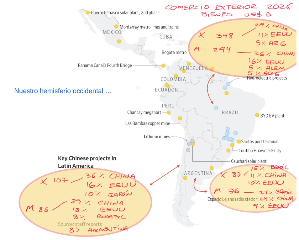 Entre Brasil y Argentina se concentra el 54% de la producción de soya del mundo – 27% en Estados unidos -, esencial en el mundo de producción de proteínas, así como el 14% del maíz mundial – 33% en Estados Unidos -. El hierro brasilero representa un 23% del comercio marítimo mundial de éste. Ni hablar del 24% del cobre de mina del mundo que sustenta Chile. Vaca Muerta en Neuquén, Argentina y el Pre-sal brasilero cambiaron el panorama energético de estos países hacia uno excedentario. Un Cono Sur claramente importante en la minería, energía y alimentos.